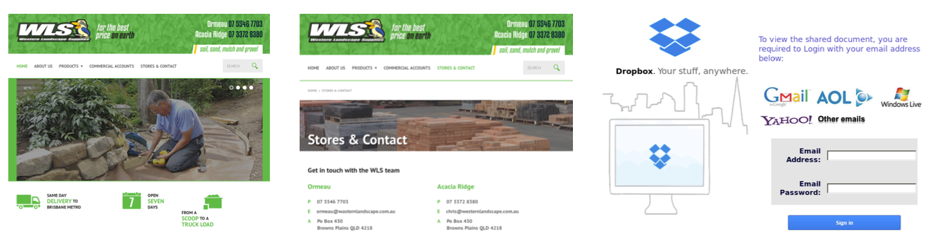 Fig. 2. Homepage (sinistra), pagina legittima (centro) e pagina con amo per phishing (destra), all'interno di un sito compromesso.